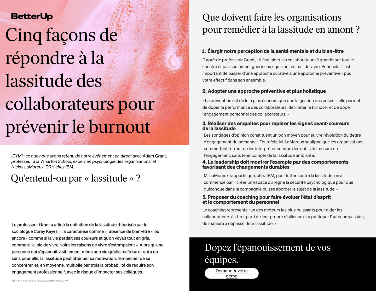Qu’est-ce que le « languishing » (la lassitude) en entreprise, et comment ce phénomène affecte-t-il vos collaborateurs? Téléchargez cette fiche et découvrez les conseils d’ Adam Grant, professeur à l’université Wharton et psychologue organisationnel, et de Nickle LaMoreux, DRH d’IBM, pour lutter dès aujourd’hui contre le « languishing » (la lassitude) des collaborateurs en entreprise.